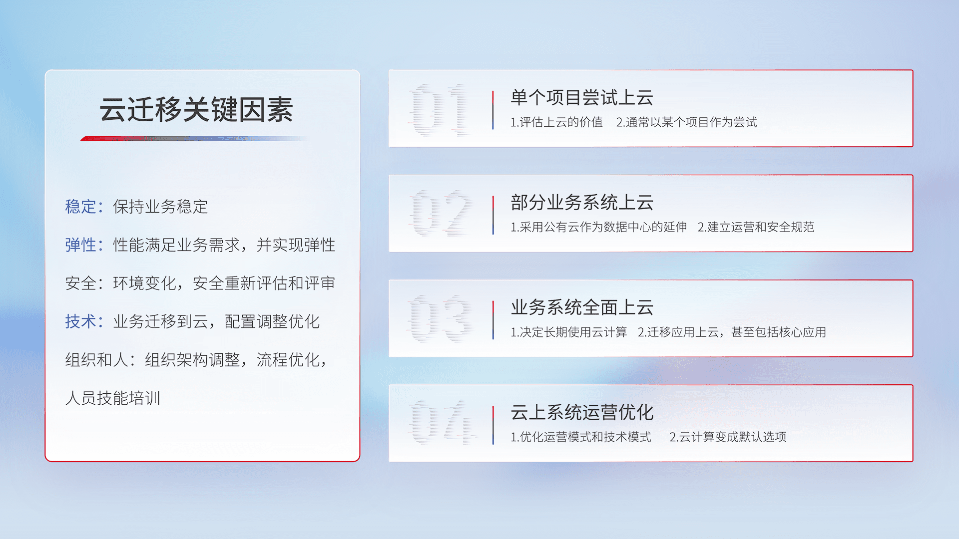 结合实际业务,,,从规划设计、、、、云平台选型、、、、云原生改造、、数据迁移、、、、集成交付,,,,迁移全过程为客户识别最佳上云路径,,做好风险识别管理,,,,设计网络架构、、、、身份权限、、安全审计合规、、操作审计、、、日志审计、、监控告警策略、、、多站点容灾设计等,,,,对云上基础设施进行整体规划,,提升IT治理水平,,,,以满足弹性、、高可用、、、、高性能的需求。。。