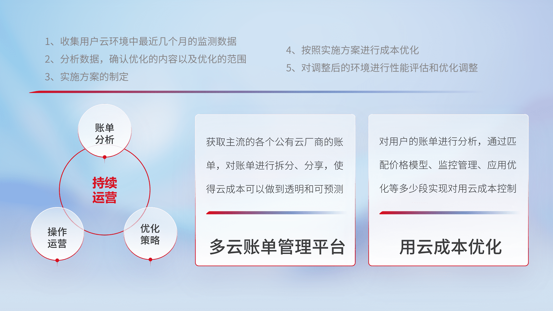 通过多云纳管,,,以统一的资源数据模型把客户的云资源进行抽象和封装,,,,进而实现对多云资源的统一操作,,保障云资源管理的可靠性、、、、稳定性与可用性。。。。量身定制化运维内容,,,配置、、、、开发运维、、、、补丁管理、、备份、、、监控、、、、认证和访问管理、、、、审计和日常巡检等,,,,保障在用云过程中的可靠度,,稳定度以及高可用率。。